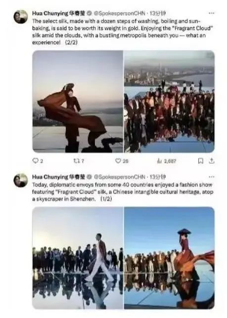 2024年1月4號(hào)“外交官看中國(guó)?廣東行”活動(dòng)一行來(lái)到廣東省深圳市,近40個(gè)國(guó)家的駐華使節(jié)走進(jìn)前海合作區(qū),了解深港兩地在口岸交通、科創(chuàng)合作等領(lǐng)域的深度融合,感受前海在推進(jìn)深港融合、賦能粵港澳大灣區(qū)高質(zhì)量發(fā)展中的作用及成果。并在深超總部深灣屋頂國(guó)際會(huì)客廳觀“天空之境”觀看了一場(chǎng)非遺文化”香云紗“時(shí)尚秀,引來(lái)了外交部部長(zhǎng)助理、發(fā)言人華春瑩的點(diǎn)贊,“身處繁華都市云間賞‘香云’紗,這是一種怎樣的體驗(yàn)!”